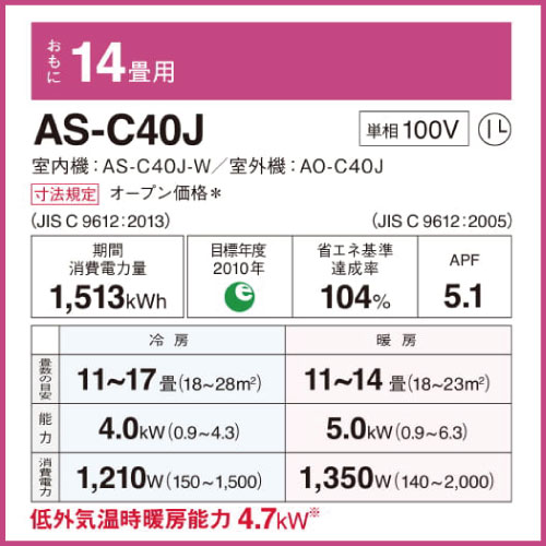 AS-C40J 富士通ゼネラル 壁掛形 nocria Cシリーズ 14畳程度