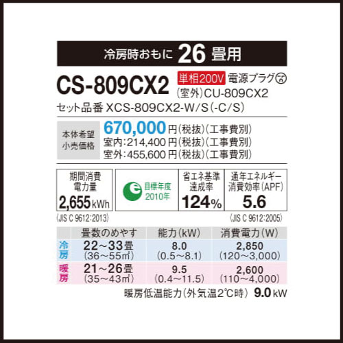 CS-809CX2 パナソニック Eolia Xシリーズ 壁掛形 26畳程度