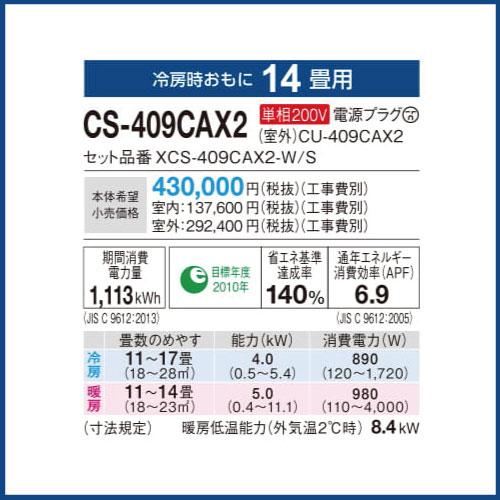 CS-409CAX2 パナソニック Eolia AXシリーズ 壁掛形 14畳程度