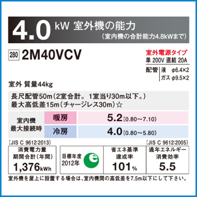 2M40VCV ダイキン マルチ用室外機・ココタス接続タイプ 【2室用 計4.8kWまで】
